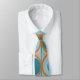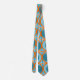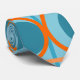 This tie has a mid-century modern design of open orange circles with solid teal circles running across the pattern with teal vertical lines and orange horizontal lines on a field of teal.