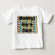 This baby t-shirt has a mid-century modern design of white “deformed” circles connected with black lines on a field of green, orange, turquoise, and gold strips. If you like the design but prefer different colours, message me.