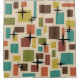 A simple 1950s abstract art design with rounded squares and rectangles in a disarrayed multicolored pattern.
