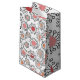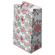 This gift bag has a mid-century modern design of flowers made of circles in shades of pink, cranberry and beige and black lines.