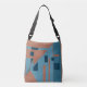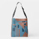 The design is Mid-Century Modern inspired with a contemporary spin. Featured is an abstract geometric design in shades of blue and tan, with the same design horizontally transposed on the flip side for complementary looks. A trendy, chic look for your everyday wear..