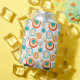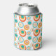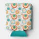 This can cooler has a mid-century modern design of concentric circles in gold, orange, and turquoise on a white background.