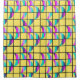 This shower curtain has a mid-century modern design of crescent moons divided horizontally into three colours, pink, blue, lavender, or seafoam, split in half and scattered on a grid with a yellow background. If you like the design but want different colours, message me.