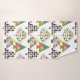 This towel set has a red washcloth, a green hand towel, and a bath towel with a mid-century modern design of Christmas trees in different styles. One has a grid with rectangles with starbursts inside. Another has rounded rectangles with smaller rectangles inside. A third has curved lines with stars on them. The final tree is a triangle with other smaller triangles inside