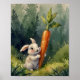 Add a touch of whimsy to your walls with the Meadow Bunny Bliss Whimsical Watercolor Poster, featuring a charming watercolor illustration of an adorable bunny clutching a large carrot while standing in a serene meadow surrounded by a lush green forest. Soft pastel hues and delicate brushstrokes create a dreamy, storybook-like quality, making this artwork a perfect addition to nurseries, children’s rooms, or any space that celebrates nature’s beauty.