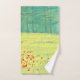 A yellow and green landscape art painting in green and yellow of a meadow or field full of wild flowers with a pine forest on the horizon. Original art by Nic Squirrell.