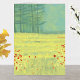 A modern contemporary landscape painting featuring a peaceful flower filled summer meadow with birds flying against the sky and a forest of pine trees in the distance. Fresh and uplifting yellow and green colours. Original art by Nic Squirrell. Blank inside for your own message.