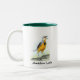 Meadow Lark on both sides of the mug with bird ID on back. Interior of cup is hunter green.