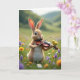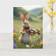 This design shows a fluffy upright rabbit with fawn-coloured fur standing in a green meadow, holding a small stringed instrument as if about to play a gentle tune 🐰. A tiny yellow bird perches close on the instrument’s curled top, leaning in with an attentive tilt that feels like a sweet, trusting bond between the two. Soft light washes over their faces, catching the rabbit’s wide, curious eyes and giving the scene a tender, companionable mood. Around them, scattered wildflowers in lavender, sunny yellow, and white dot the grass like little signals of affection 🌷. The background fades into rolling green hills and a pale sky, with a blurred, dreamy look that keeps the focus on the pair. Near the top, the greeting text sits centred in a light pastel tone, and a smaller line of text rests below it in a slightly darker shade for contrast. Fine details show the rabbit’s downy fur texture, the instrument’s smooth wooden surface, and the bird’s bright feathers against the soft-focus field.