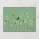 A simple line drawing on a green background in soft pastels featuring some long grass stalks, flowers and a sweet little bird.