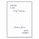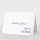 This place card is easy to personalise online using the online personalisation template before ordering, to show the name of a guest, the number of the table that they will be sitting at and also their choice of meal. The printed place card will arrive flat and so will need folding in half before use. The size before folding is approximately 5" height by 3.5" width, intended to be folded so approximately 2.5" by 3.5" after folding. Once folded as intended, the guest name and table number and meal choice will show on both of the outer sides (so as to be visible from both sides of a table). The place card features dark blue text on an elegant white background. A neatly-personalised place card for a stylish wedding or other special occasion.