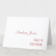 This place card is easy to personalise online using the online personalisation template before ordering, to show the name of a guest, the number of the table that they will be sitting at and also their choice of meal. The printed place card will arrive flat and so will need folding in half before use. The size before folding is approximately 5" height by 3.5" width, intended to be folded so approximately 2.5" by 3.5" after folding. Once folded as intended, the guest name and table number and meal choice will show on both of the outer sides (so as to be visible from both sides of a table). The place card features "dusty rose pink" colour text on an elegant white background. A neatly-personalised place card for a stylish wedding or other special occasion.