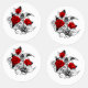 Contour, mechanical crescent moon with gears, decorated with red roses with black spiked stems and leaves on white background. Steampunk