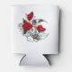 Contour, mechanical crescent moon with gears, decorated with red roses with black spiked stems and leaves on white background. Steampunk