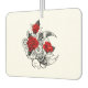 Contour, mechanical crescent moon with gears, decorated with red roses with black spiked stems and leaves on white background. Steampunk