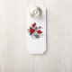 Contour, mechanical crescent moon with gears, decorated with red roses with black spiked stems and leaves on white background. Steampunk
