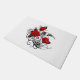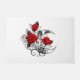 Contour, mechanical crescent moon with gears, decorated with red roses with black spiked stems and leaves on white background. Steampunk