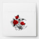 Contour, mechanical crescent moon with gears, decorated with red roses with black spiked stems and leaves on white background. Steampunk