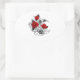 Contour, mechanical crescent moon with gears, decorated with red roses with black spiked stems and leaves on white background. Steampunk