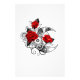 Contour, mechanical crescent moon with gears, decorated with red roses with black spiked stems and leaves on white background. Steampunk