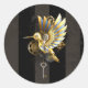 Steampunk, antique, golden, mechanical hummingbird with brass gears and silver key on striped, brown background. Gold bird.