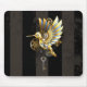 Steampunk, antique, golden, mechanical hummingbird with brass gears and silver key on striped, brown background. Gold bird.