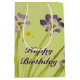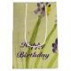 Gift bag in floral art pattern using purples, and lime green. The happy birthday text can be personalised to suit any special celebration, or occasion. The text is also removable.