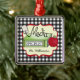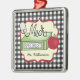An ornament for the school media specialist featuring a design consisting of a book, a computer mouse, and an apple inside a red frame. Text reads "Media Specialist." Personalise with your name at bottom. Background is grey gingham.
