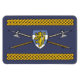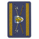 Late mediaeval poleaxes are crossed behind a heater-shaped shield bearing a heraldic lion in this original design by Richard H. Fay.