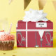 Creative medical school grad gift wrap featuring unique red hospital scrubs, stethoscope and funny Swiss Army knife. Edit text to add physician's name.