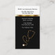 Multi line medical insurance business cards with powerful black and white two side design that includes a gold coloured divider line printed on the front, a medical stethoscope symbol, and text layout you can customise and personalise, all presented on a vertical business card format. Best business cards for a medical insurance agent, agency, and their sales reps.