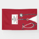 Creative doctor graduation congrats banner featuring unique red hospital scrubs for medical school grad party. To personalize edit text to add physician's name and medical credentials.