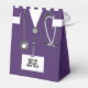 Medical-themed party favour boxes for doctor graduation party, featuring purple hospital scrubs. Edit text to personalise for medical school graduation celebrations.