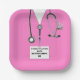 Unique doctor graduation party plates featuring creative pink hospital scrubs, funny Swiss army knife and personalised congrats for medical or nursing school grad.