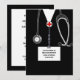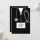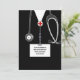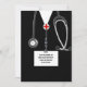 Creative doctor graduation party invites or announcements for medical school grad featuring unique black hospital scrubs and stethoscope.