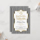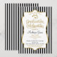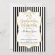 An elegant black and gold Medical School graduation party invitation featuring faux gold glitter accent frame and black and white stripes with gold and black text and a stethoscope. A cute and elegant doctor med school Class Of Medical School grad invite.