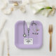 Unique medical-themed party plates featuring creative lavender hospital scrubs, stethoscope, and Swiss Army knife. Edit text to add doctor's name.