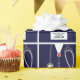 Creative doctor graduation giftwrap featuring navy blue hospital scrubs, stethoscope, and a Swiss Army knife. Edit text to add physician's name.