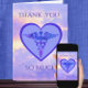 Thank you card for doctor, nurse, or other medical care providers. A colourful caduceus, the official insignia of the United States Medical Corps, is framed within a two-tone blue heart. The background is an amazing sky with rays of sunshine streaming through clouds. Thank You So Much is on the front of the card. The inside greeting reads: If the world had more people like you