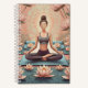 A pink and green meditation journal feauturing a woman mediating among lotus flowers.