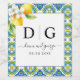 Mediterranean blue and yellow tiles, lemon wedding wine label