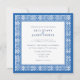 An elegant wedding invitation featuring a Greek key frame in cool Aegean / Mediterranean colours.