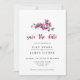 An elegant wedding save the date invitation featuring a watercolor Mediterranean bougainvillea branch in pink and burgundy with some greenery.