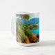 Mediterranean coastline view on ceramic coffee mug with turquoise sea, lush greenery, and rocky cliffs, ideal for travel lovers and coastal décor.