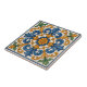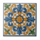 Brighten your space with this captivating decorative tile, featuring a rich palette of cobalt blue, golden yellow, and fresh green. A central orange flower anchors an elegant scroll and leaf motif, all framed by a classic blue border. Perfect for adding a cheerful and artistic touch to backsplashes, accent walls, or creative home projects. Elevate your interior with the timeless beauty of this decorative tile, reminiscent of traditional hand-painted Italian or Spanish ceramics. This stunning piece showcases a harmonious symmetrical design, with bold cobalt blue scrolls and elegant golden acanthus leaves gracefully intertwining around a warm orange central flower. Lush green foliage accents the corners, adding a refreshing touch of nature. The crisp white background and deep blue border beautifully define this intricate pattern, making it ideal for creating luxurious feature walls, unique fireplace surrounds, or charming kitchen accents. This versatile tile is an excellent choice for adding character and an inviting warmth to any room, from a sunlit kitchen to a tranquil bathroom, bringing a touch of "Old-World" charm with a lively twist. The perfect balance of classic design and vibrant colour