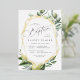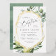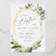 Beautiful nature theme baptism invitations for spring or summer feature grey lettering framed by a gold foil geometric border and delicate watercolor illustrations of Mediterranean greenery, leaves, olives, and lemons. Personalise with your church ceremony and celebration details. A modern choice in a natural colour scheme for boho or nature themed events.