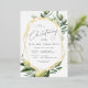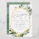 Beautiful nature theme christening invitations for spring or summer feature grey lettering framed by a gold foil geometric border and delicate watercolor illustrations of Mediterranean greenery, leaves, olives, and lemons. Personalise with your church ceremony and celebration details. A modern choice in a natural colour scheme for boho or nature themed events.