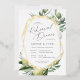 Beautiful nature theme rehearsal dinner invitations for spring or summer feature grey lettering framed by a gold foil geometric border and delicate watercolor illustrations of Mediterranean greenery, leaves, olives, and lemons. A modern choice in a natural colour scheme for boho or nature themed wedding rehearsal dinners.