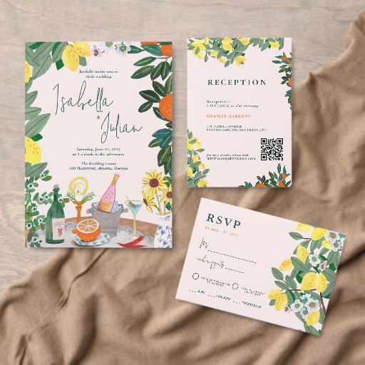 Introducing our Mediterranean-inspired wedding invitation, perfect for your upcoming spring or summer wedding. This invitation boasts an Italian sunset vibrant yellow, orange and green colour scheme on a soft pink background, featuring a stunning lemon illustration that captures the essence of the Mediterranean. The design is inspired by the sunny beaches of Italy, the rolling hills of the Amalfi Coast, the charming villages of Positano, the breathtaking views of Lake Como, the picturesque landscapes of Santorini in Greece, and other romantic destinations in the Mediterranean. This invitation is a beautiful representation of the warm and inviting spirit of the Mediterranean, and is sure to set the tone for an unforgettable wedding celebration. Whether you're planning a destination wedding in one of these breathtaking locations, or simply want to bring a touch of the Mediterranean to your special day, this invitation is the perfect choice. So why wait? Order your Mediterranean-inspired wedding invitations today, and get ready to bring the beauty of the Mediterranean to your special day! Original artwork by Caroline Bonne Müller