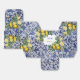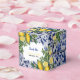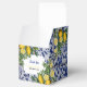Hand painted traditional tiles from Portugal design with Mediterranean lemons. Azulejo blue and white floral leaf tile artwork. A beautiful Mediterranean design depicting yellow lemons with their greenery and blossoms against a blue and white vintage Portuguese pattern. The wedding text is elegantly framed with a white geometric shape. Unique Azulejo blue and white floral wedding favour box design with modern elements. Matching wedding invitations and other stationery items are also available.